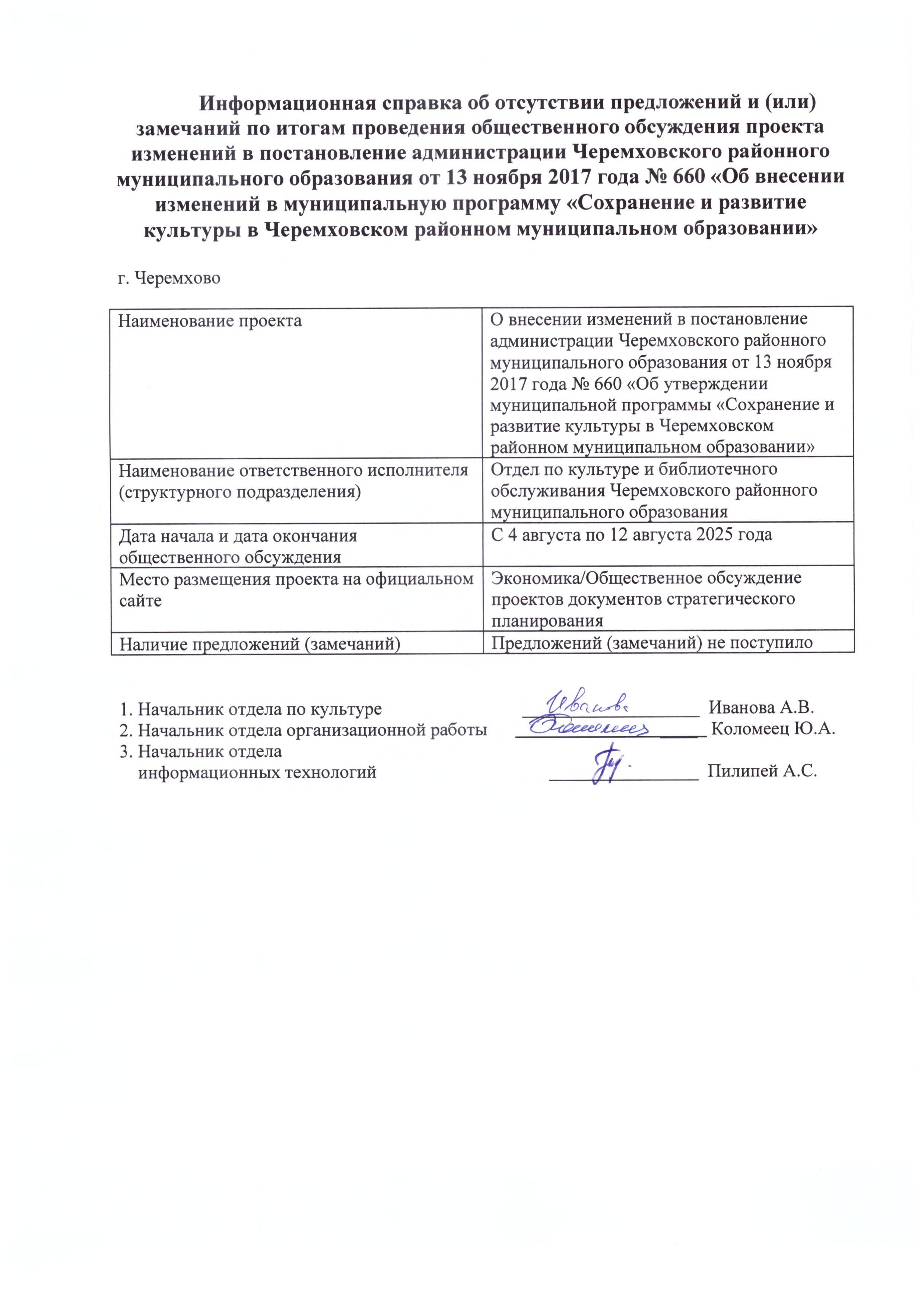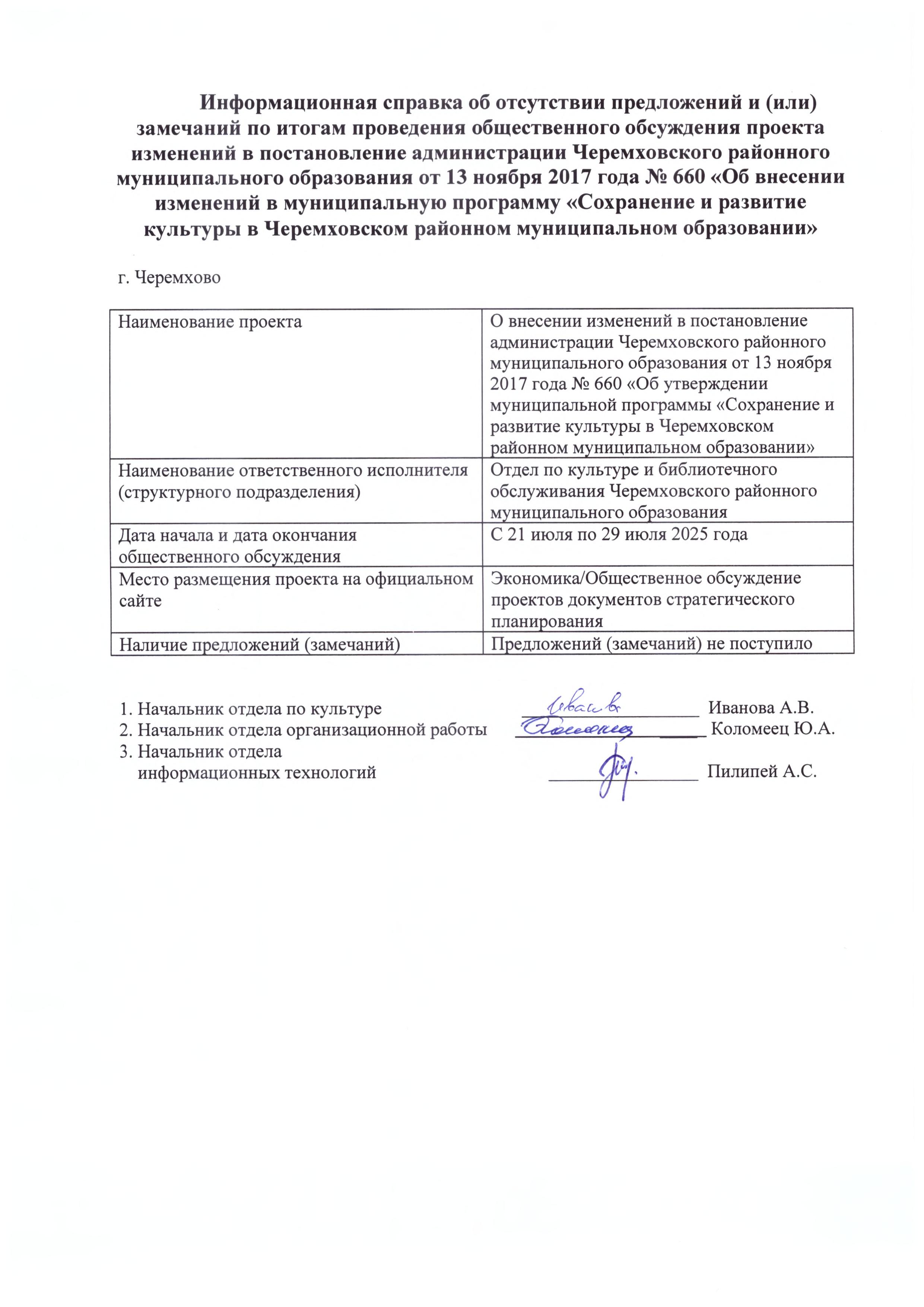 Информационная справка об отсутствии предложений и (или) замечаний по итогам проведения общественного обсуждения проекта изменений в постановление администрации Черемховского районного муниципального образования от 13 ноября 2017 года № 660 «Об внесении изменений в муниципальную программу «Сохранение и развитие культуры в Черемховском районном муниципальном образовании»