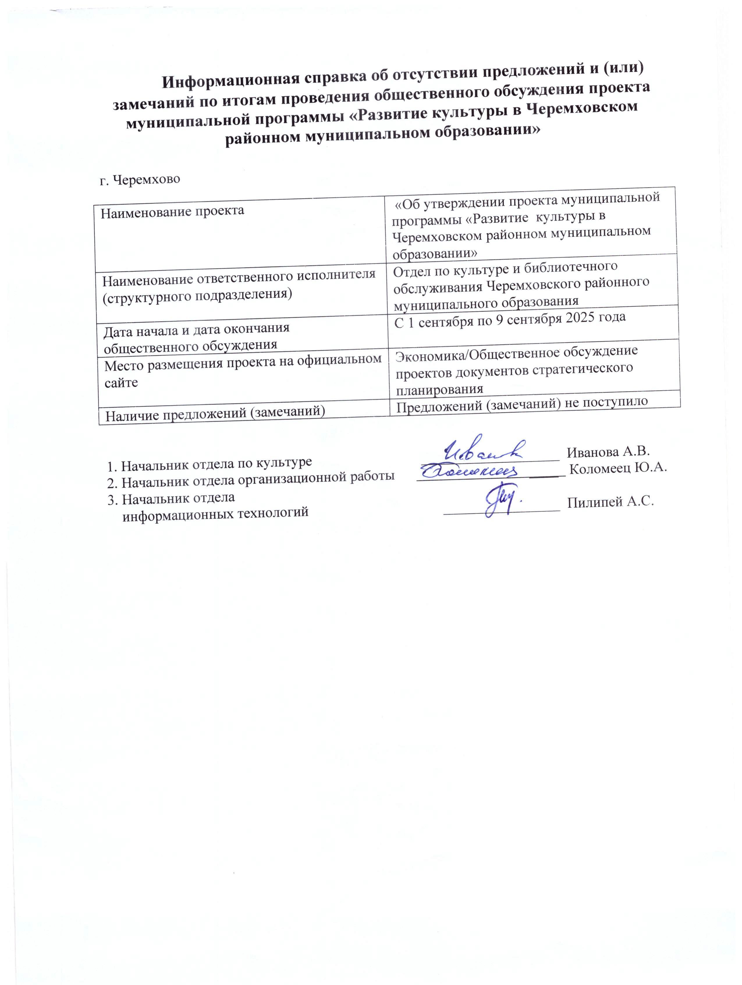 Информационная справка об отсутствии предложений и (или) замечаний по итогам проведения общественного обсуждения проекта муниципальной программы «Развитие культуры в Черемховском районном муниципальном образовании»